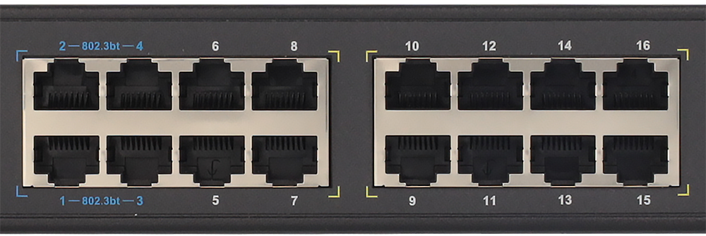 16 x 1 Gb/s - IEEE 802.3af/at, IEEE 802.3af/at/bt, PoE+, PoE++ 52V DC, 30W/port, 60W/port, 240W/all ports Tryb Long Range: OFF – 100m/1Gb/s or ON – 250m/10Mb/s (9÷16 ports) VLAN Storm control |