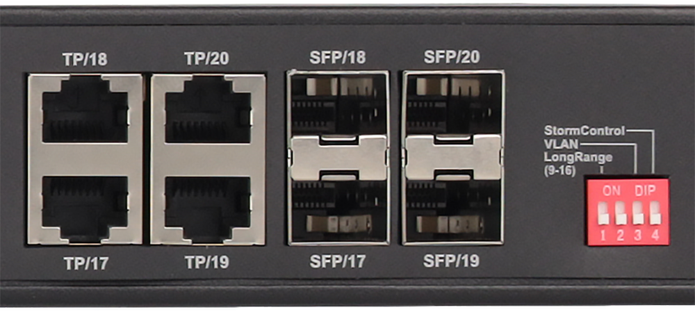 SFG120WP-BT is a 20-port PoE switch designed to supply IP cameras operating in the IEEE 802.3af/at/bt standard. Automatic detection of any devices powered in the PoE/PoE+ standard is enabled at the 1 – 16 ports of the switch, and HiPoE for ports 1 – 4. The ports marked TP/17-20 are used to connect additional network devices via an RJ45 connector. Switch also has four SFP sockets (marked SFP/17-20), which after using SFP modules (GBICs) enable fiber optic transmission. |