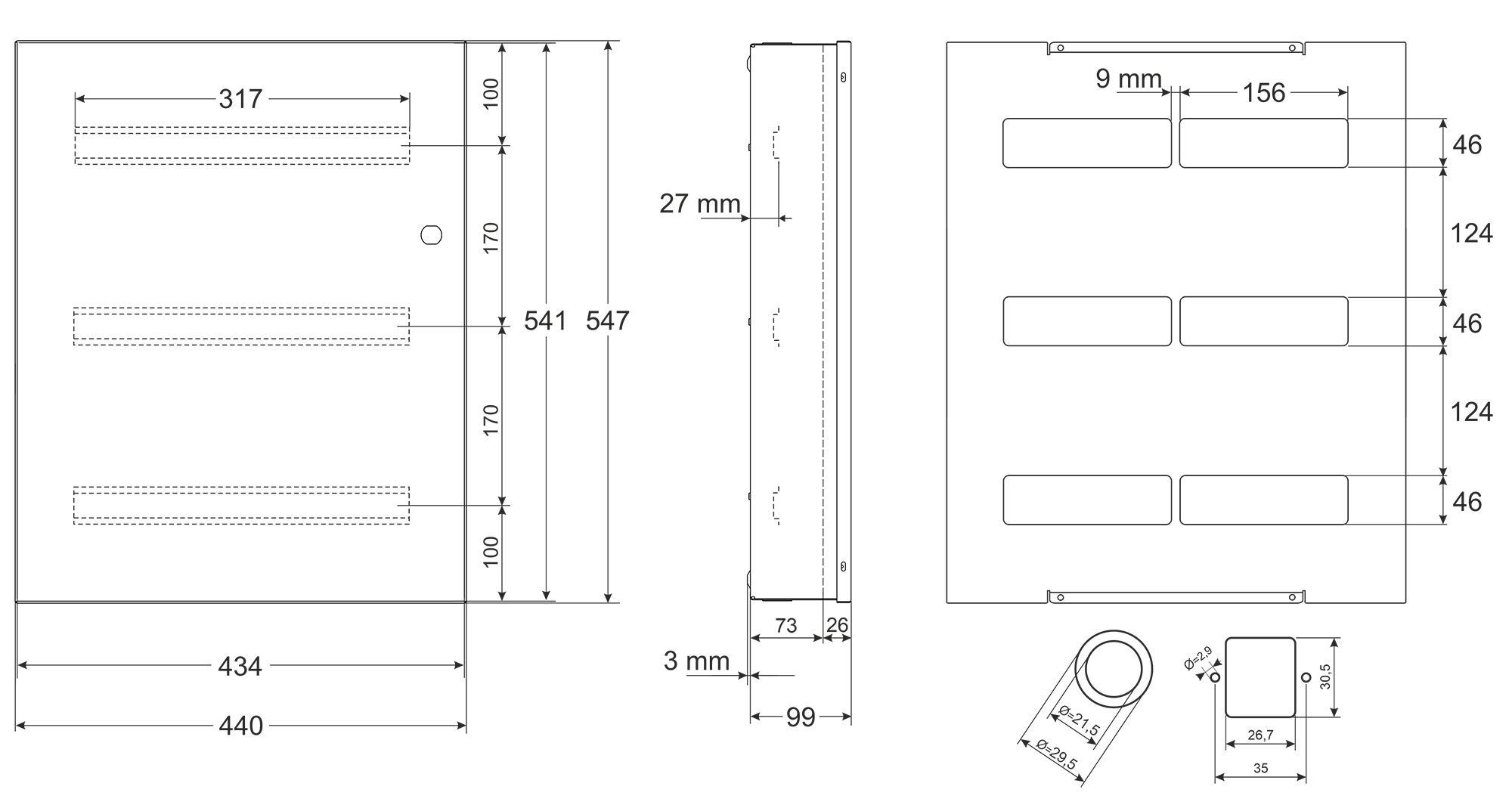 - knockouts: Φ21,5 / Φ29,5 mm (for cable glands) - knockout: 26,7 x 30,5 mm (for IEC C14 socket with fuse) |