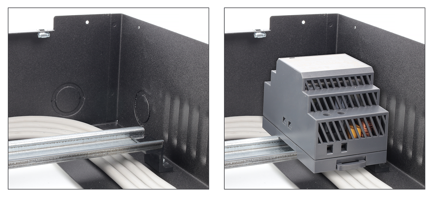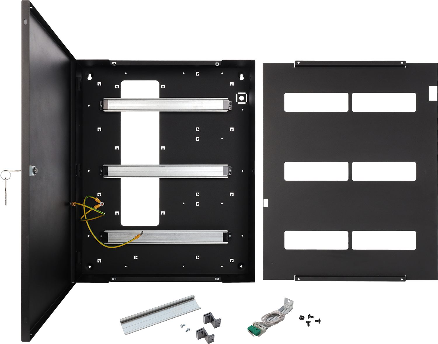 These enclosures are designed for the DIN rail mounting of ICT company access control system devices, including: Controller Modules: PRT-CTRL-DIN-.... / PRT-WX-DIN-… Expander Modules: PRT-RDM2-DIN-… / PRT-HRDM-DIN-… / PRT-ZX16-DIN-… / ......... Power Supply Modules: PRT-PSU-DIN-… The design allows for the mounting of ICT modules in both full-size and half-size formats. |