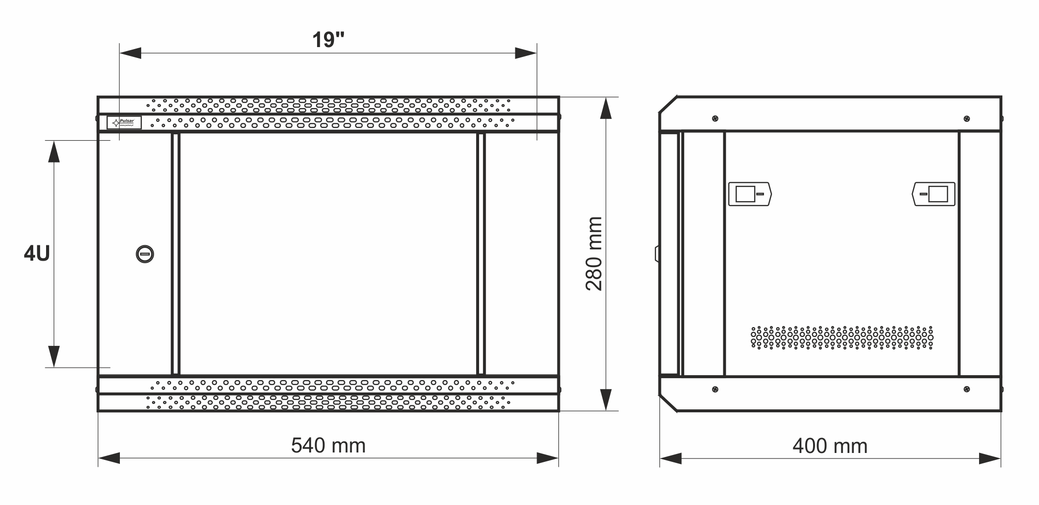 - adjustable distance between front and rear RACK rails - ventilation hole in the top panel (1 x 105x105mm - installation dimensions) - cable ducts in the top and bottom panel (175x58mm) - changeable door – right or left |