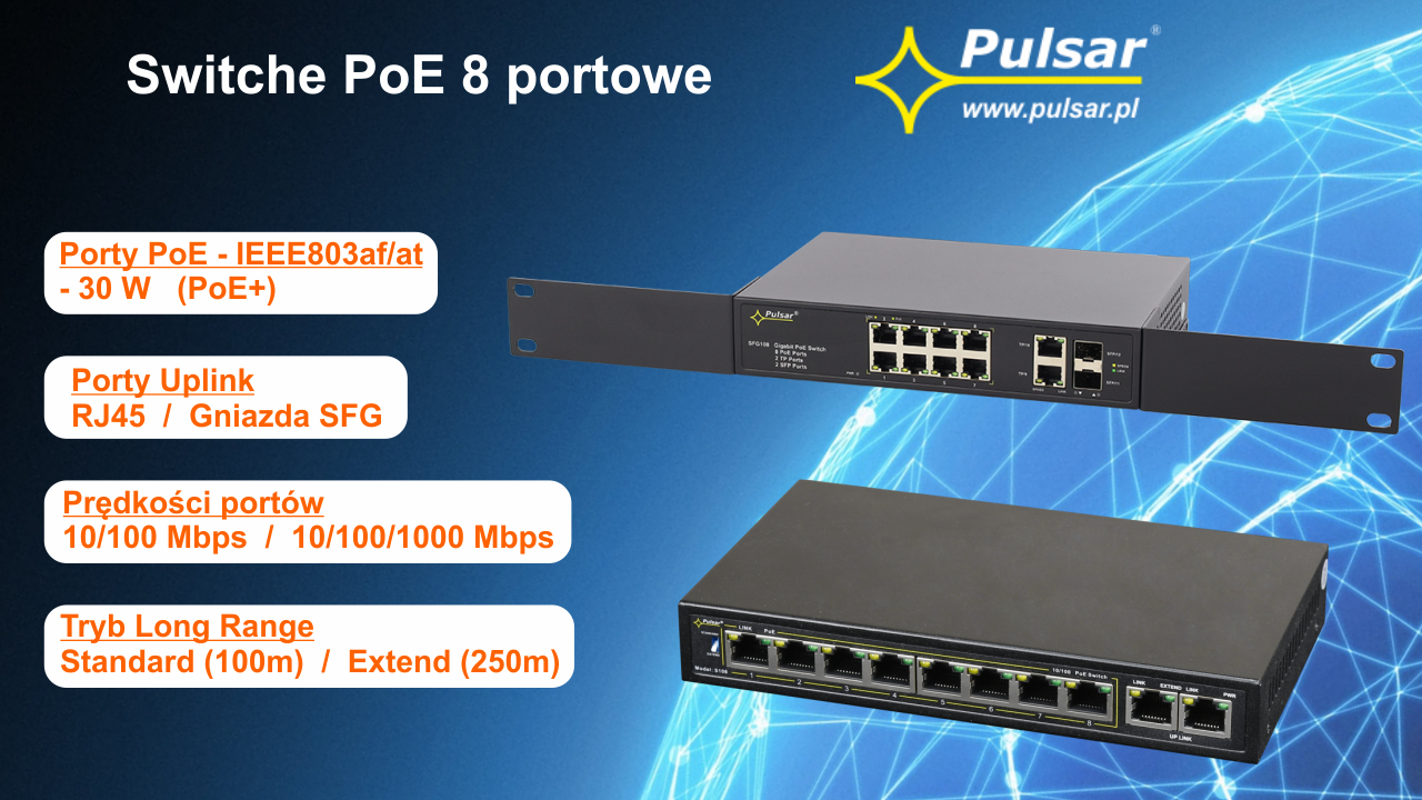 Pulsar oferuje szeroką gamę 8-portowych switchy PoE, które idealnie nadają się do zasilania kamer IP, punktów dostępu bezprzewodowego, telefonów VoIP i innych urządzeń zgodnych ze standardem PoE. Nasze switche PoE 8 portowe są łatwe w instalacji i konfiguracji, zapewniają stabilną i wydajną transmisję danych. Dostępne są w różnych wariantach mocy i budżetu.