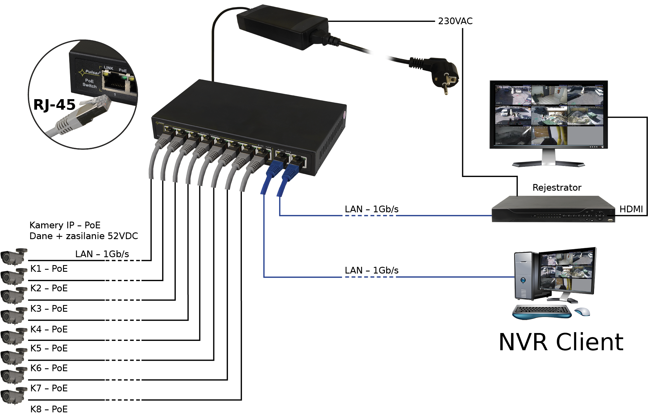 8 x 1 Gb/s - IEEE 802.3af/at, PoE+ 52V DC, 30W/port, 96W/wszystkie porty |