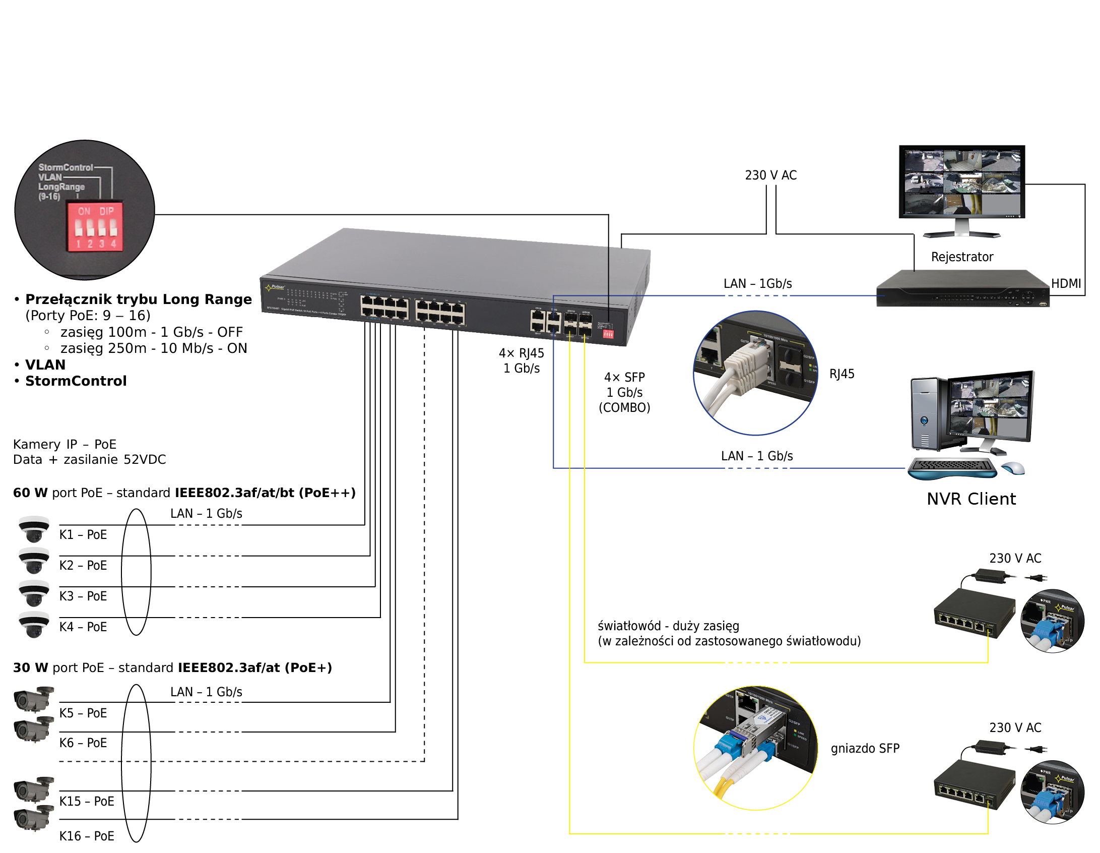 16 x 1 Gb/s - IEEE 802.3af/at, IEEE 802.3af/at/bt, PoE+, PoE++ 52V DC, 30W/port, 60W/port, 160W/wszystkie porty Tryb Long Range: OFF – 100m/1Gb/s lub ON – 250m/10Mb/s (porty 9÷16) VLAN Storm control |
