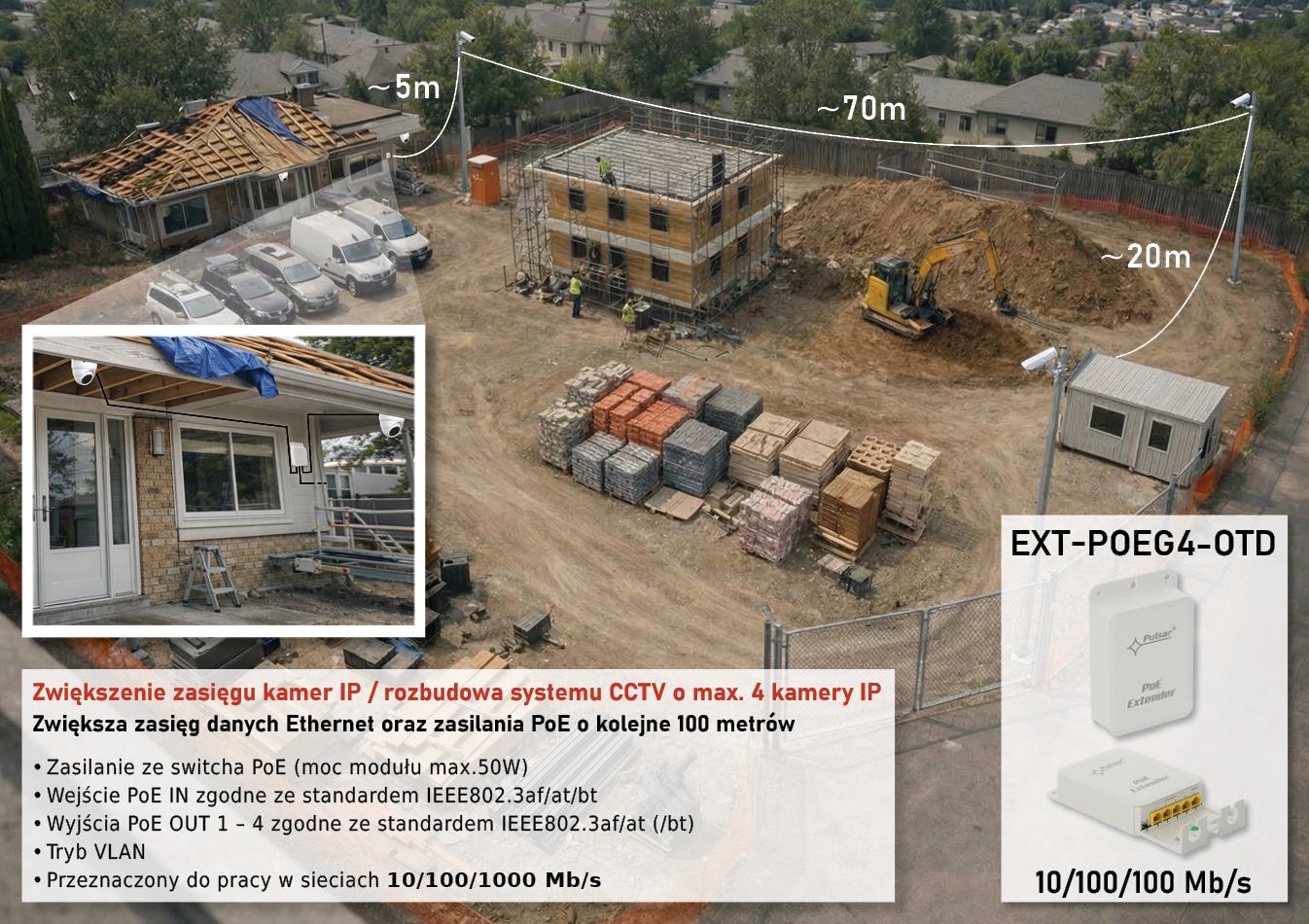 Zwiększa zasięg danych Ethernet oraz zasilania PoE o kolejne 100m. Umożliwia podłączenie czterech kamer IP PoE przy wykorzystaniu jednego przewodu. |